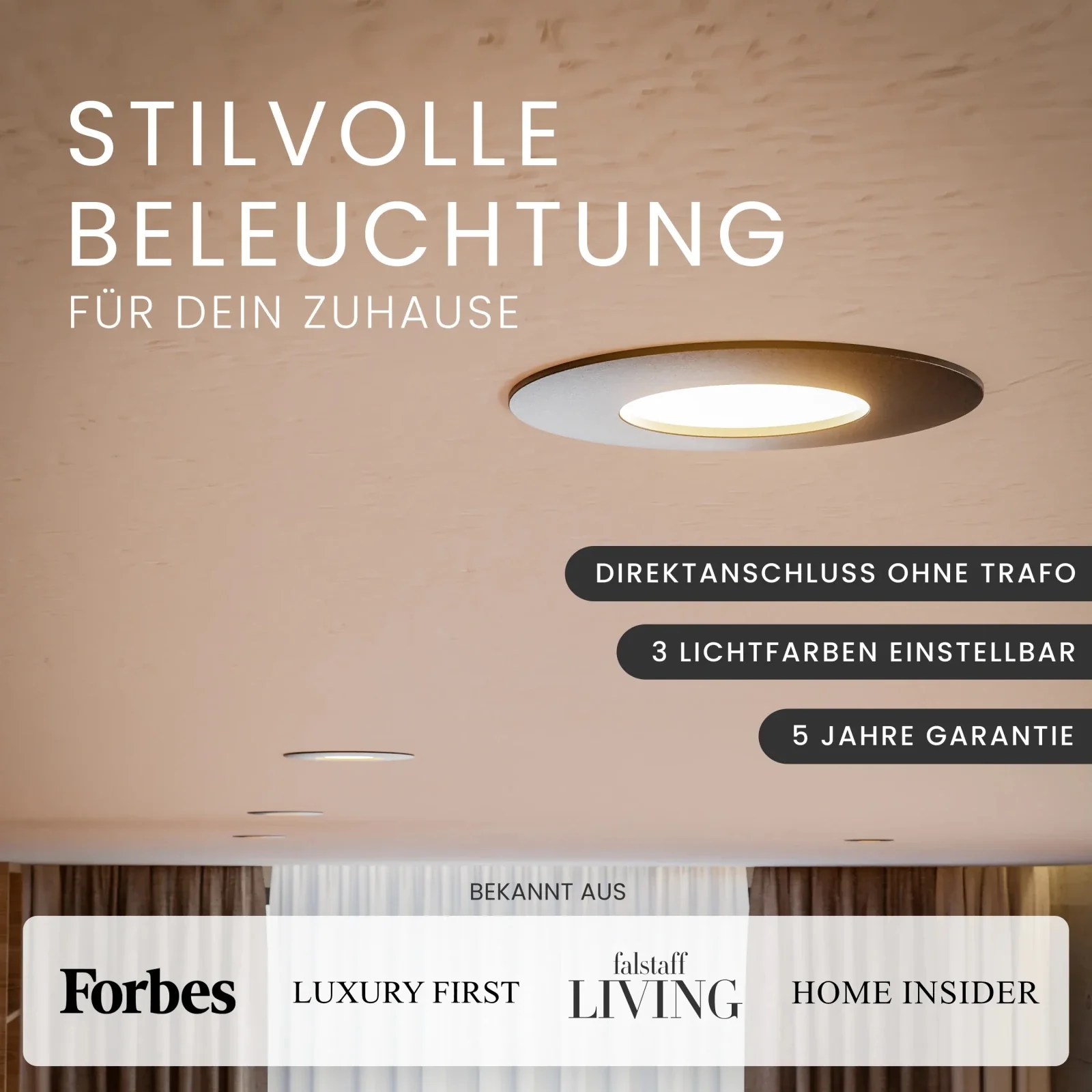 Das integrierte LED-Modul mit hoher Farbwiedergabe (CRI 90+) sorgt für natürliche, lebendige Lichtverhältnisse. Dank drei wählbarer Lichtfarben und optionaler Dimmung passt sich NUA flexibel an jede Stimmung und Nutzung an – und überzeugt dabei mit einfacher Planung und unkomplizierter Installation.