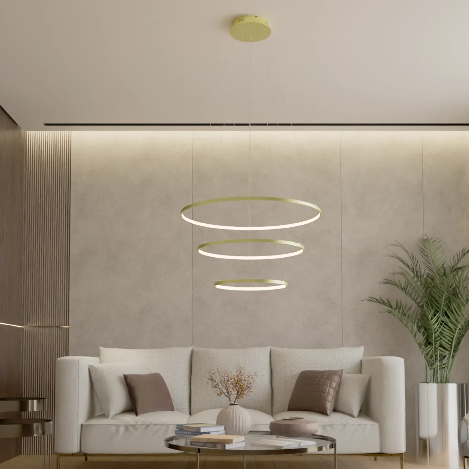 MIRA kombiniert drei elegante Leuchtringe aus pulverbeschichtetem Aluminium mit individuell verstellbaren Hängeseilen für ein einzigartiges Design.