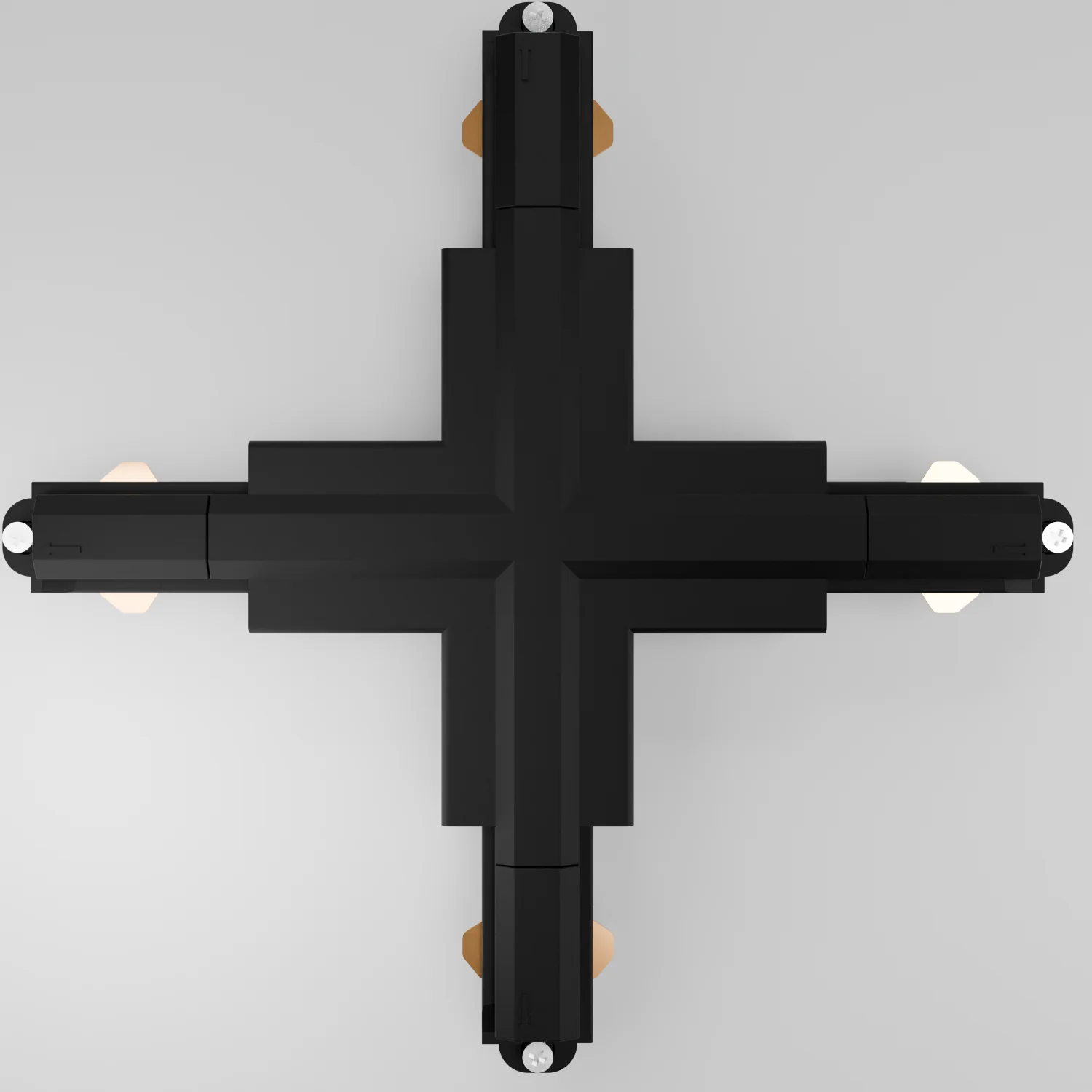 Ermöglicht eine X-förmige Verbindung von vier Stromschienen. Kann zusätzlich als Stromeinspeisung genutzt werden (deckenseitige Kabeleinführung).